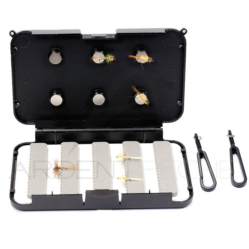Le système parfait de stockage et de protection des mouches sur la veste.Accrochez ce porte-mouches pratique devant votre poitrine pour un accès facile.Les grandes ouvertures latérales facilitent la ventilation et la mousse principale Micro Slit Foam retient les mouches.Un plot magnétique et de la mousse sur le couvercle servent de supports temporaires pour les mouches.Dimensions : 110 X 82 X 15 mm.Contenance : 110 mouches moyennes ou grosses.Mousse haute densité + 6 aimantsLivré avec épingle et 2 mousquetons de fixation.Livré sans les mouches.