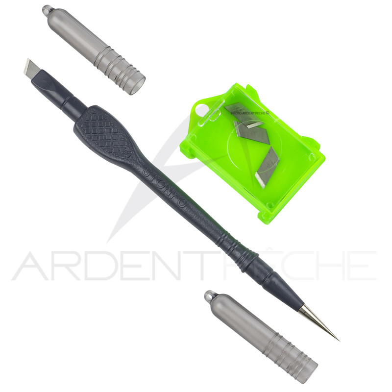 Outil équipé d'une lame spéciale en V qui permet de couper le fil rapidement et avec précision. À l'autre extrémité, l'outil est équipé d'une aiguille courte et pointue en acier inoxydable.- Lames de rechange inclus