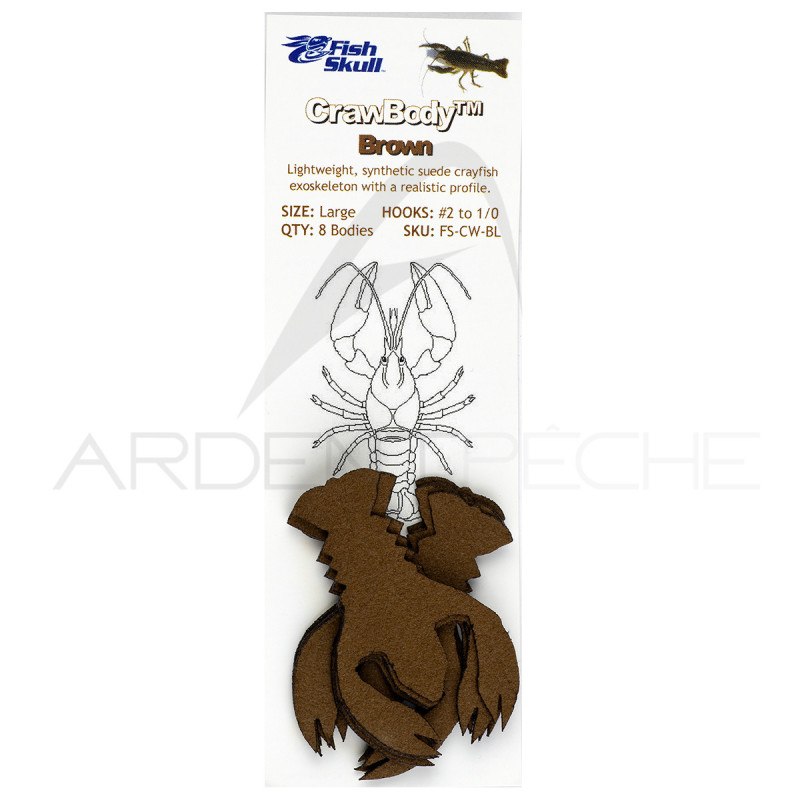 These crayfish exoskeletons are made from almost indestructible and ultralight synthetic suede that cannot be cut, does not shrink and offers realistic texture and movement when wet. Each suede body is laser-cut with precision, making it 100% identical and allowing very fine details to be achieved.- Medium size for hook 4 and 2- Large size for hook 2 and 1/0- X-large size for hook 1 to 3/0