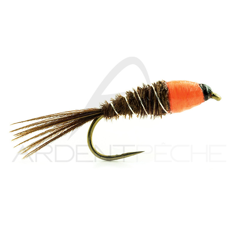 Weighted nymph model without bead, with pheasant tail herl body, designed for fishing in slow currents. This fly imitates a mayfly larva and can be used alone or on a team of flies. To try in lakes and reservoirs, animated just below the surface...