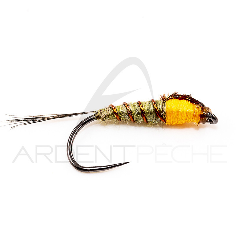 Modèle de nymphe lestée sans bille à corps en dubbing antron olive, est destiné aux pêches dans les courants lents.Cette mouche imite une larve d'éphémère et peut être utilisée seule ou sur un train de mouches.A essayer en lacs et réservoirs, animé juste sous la surface...
