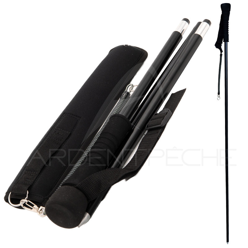 A wading staff that unfolds automatically when taken out of its case. It is attached to the belt by its spiral cord. A very practical accessory for moving safely in rivers.
