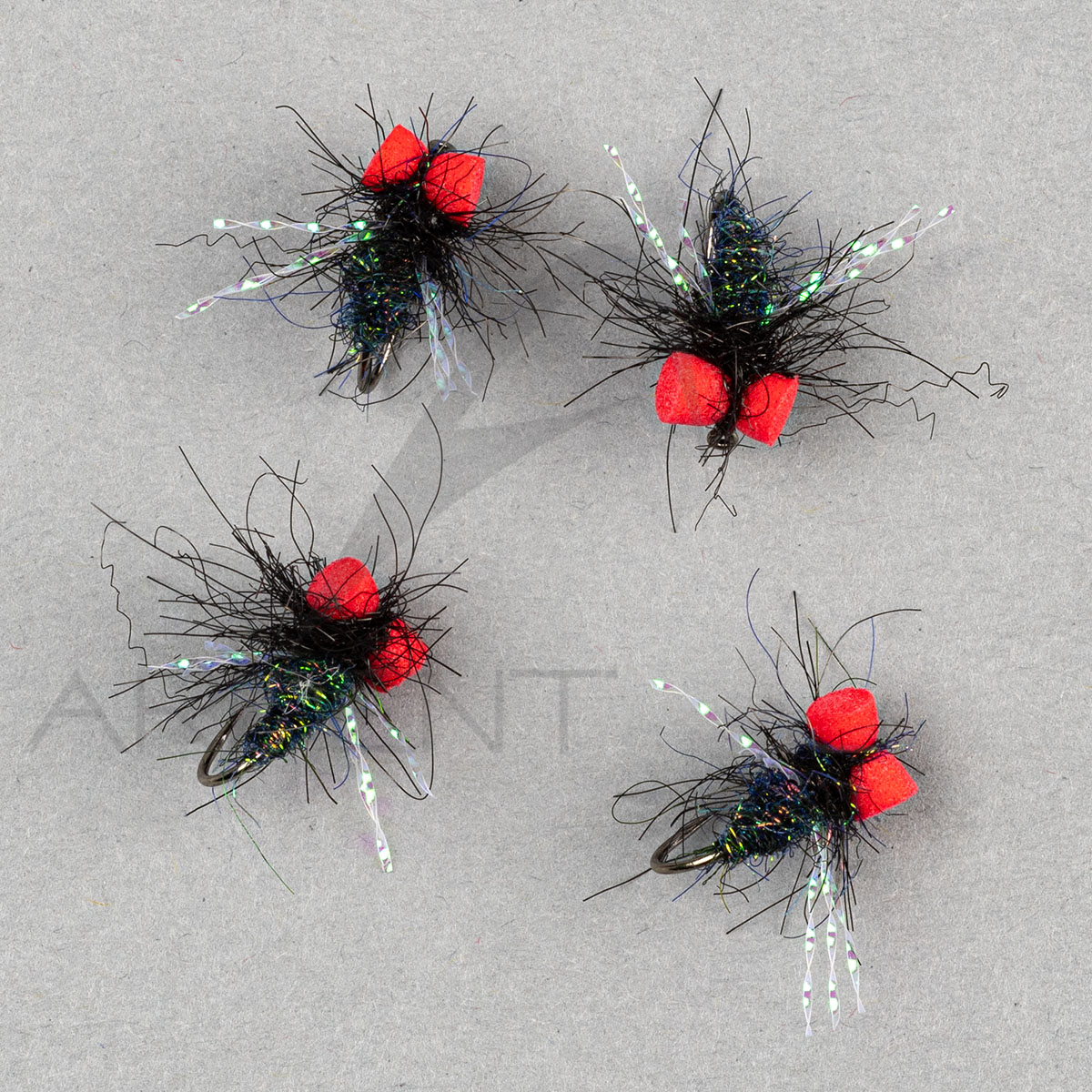 Imitation de la mouche de maison (Musca domestica), très efficace en période chaude et par eaux basses et claires. Cette petite mouche sombre, aux ailes brillantes, flotte bas et dérive engluée dans la pellicule. Elle est très bien acceptée par les truites.